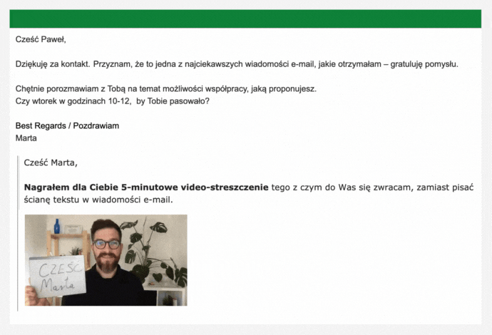 Wysyłając spersonalizowane video, od razu zrobisz pozytywne pierwsze wrażenie na kliencie, nie wychodząc z domu czy biura. Doceni on Twój profesjonalizm i nacisk na jakość obsługi klienta. Wiadomości email będą zawierać grafikę, zachęcającą do odtworzenia filmu, znajdującego się w dodanym linku.